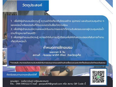 2. เพื่อให้ผู้เข้าอบรมมีความตระหนักในบทบาทและหน้าที่ความรับผิดชอบของผู้ควบคุมหม้อน้ำตามที่กฎหมายกำหนดไว้